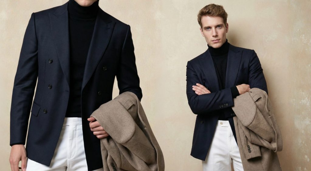 Les blazers à la structure allégée se portent volontiers sur un pull fin ou une chemise sans cravate, tandis que les pantalons en laine souple ou les chinos premium offrent un confort appréciable tout en conservant une allure soignée. Le knitwear fin, qu’il s’agisse d’un col V ou d’un col roulé, apporte une touche contemporaine et maîtrisée à la tenue professionnelle.